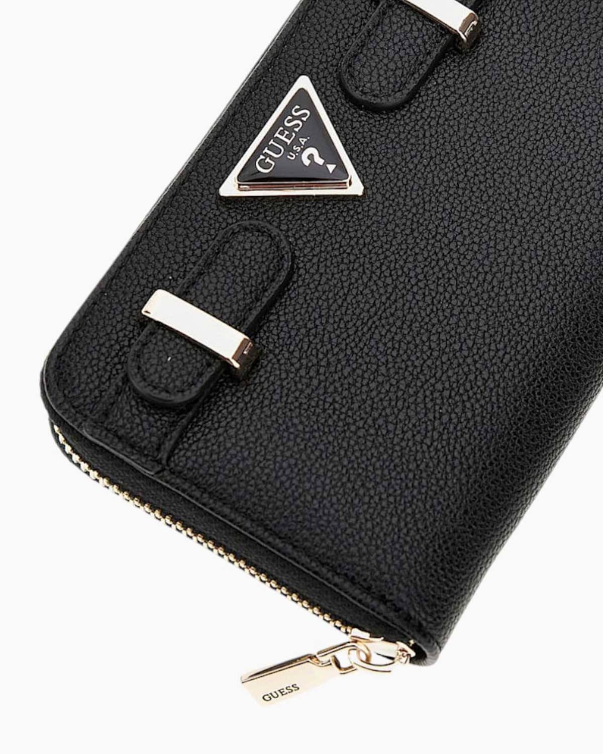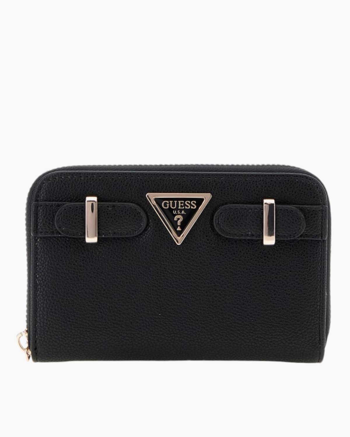 Fermuarlı kapanışı ve geniş kart bölmeleri sayesinde hem güvenli hem de düzenli bir kullanım sunar. Fermuarlı bozuk para bölmesi, küçük eşyaların ve bozuk paraların pratik bir şekilde saklanmasına olanak tanır. Önde yer alan metal üçgen Guess logosu, bu cüzdana markanın imzasını atan sofistike bir detaydır.