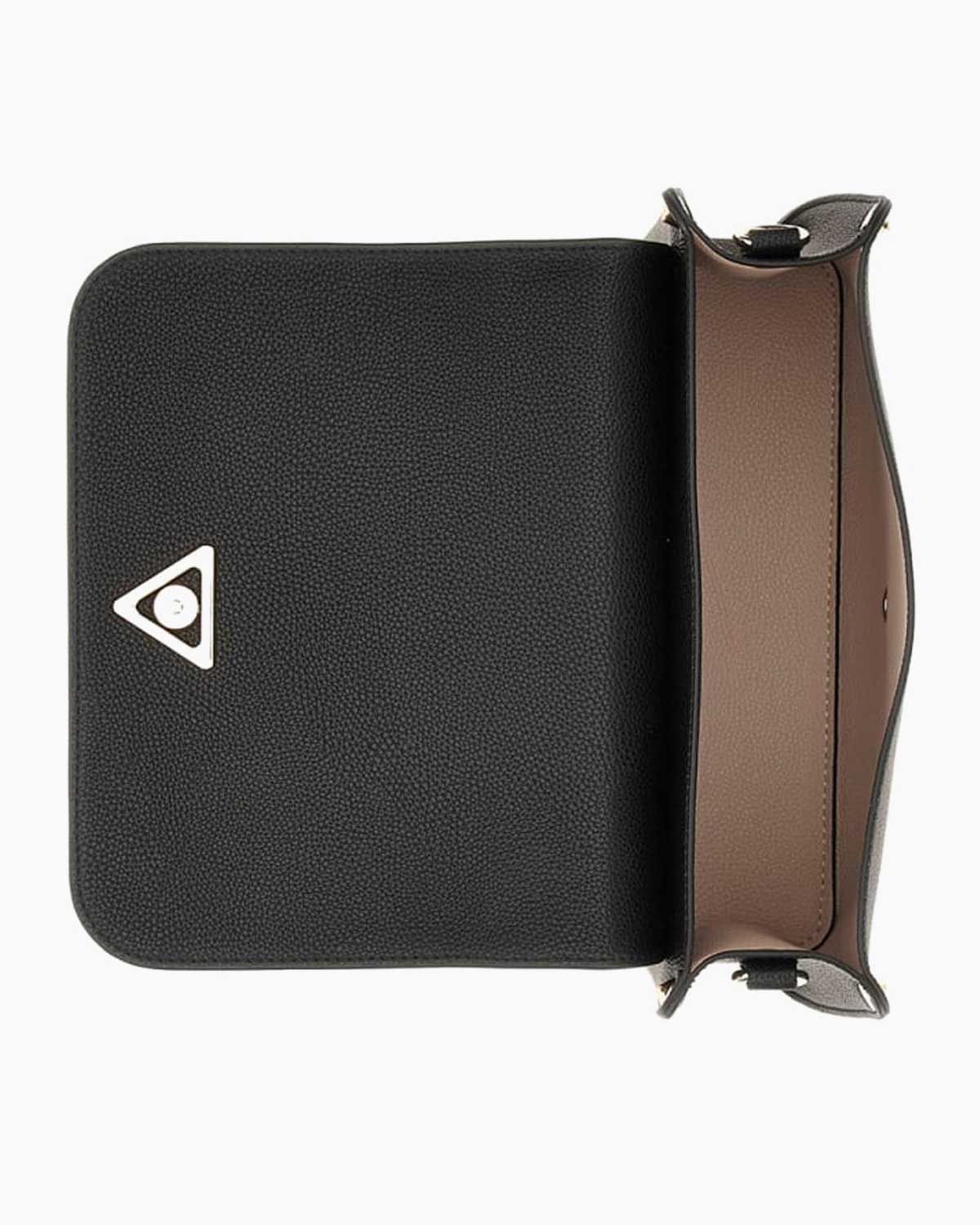 Altın tonlu Guess üçgen logosu ve metal detaylarla süslenen bu model, çıkarılabilir ve ayarlanabilir omuz askısı sayesinde hem omuz çantası hem de çapraz çanta olarak kullanılabilir.