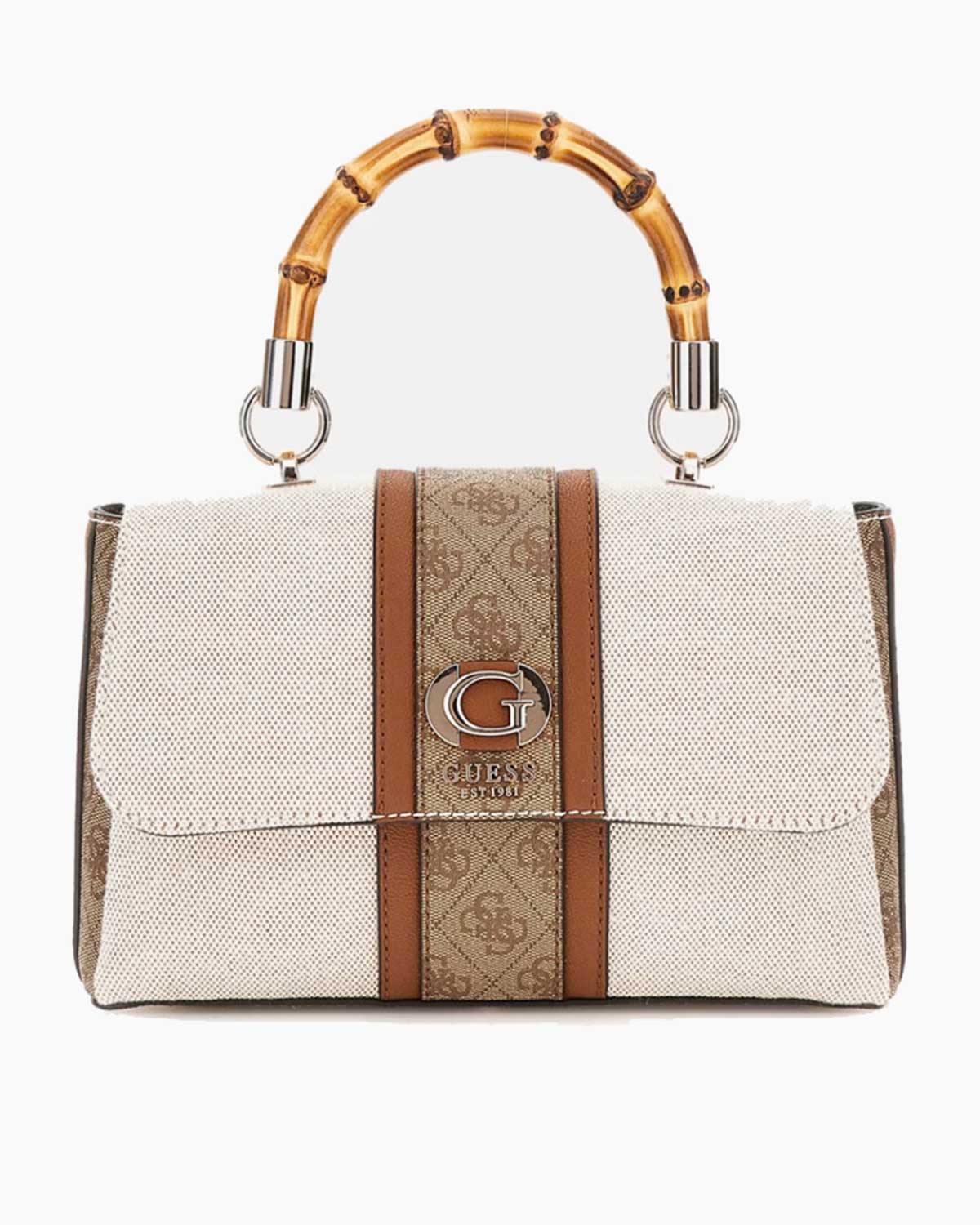 Bambu sapı, çantaya doğal bir dokunuş katarak, hem estetik hem de konfor sunar. Kapaklı ve düğmeli kapama mekanizması, eşyalarınızı güvenle saklamanızı sağlarken, donuk altın rengi metal detaylar çantanın lüks havasını artırır. 4G logo desenli detaylar, Guess markasının modern ve şık tasarım anlayışını yansıtır.
