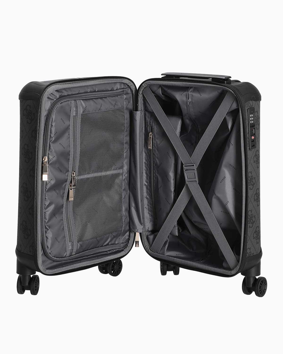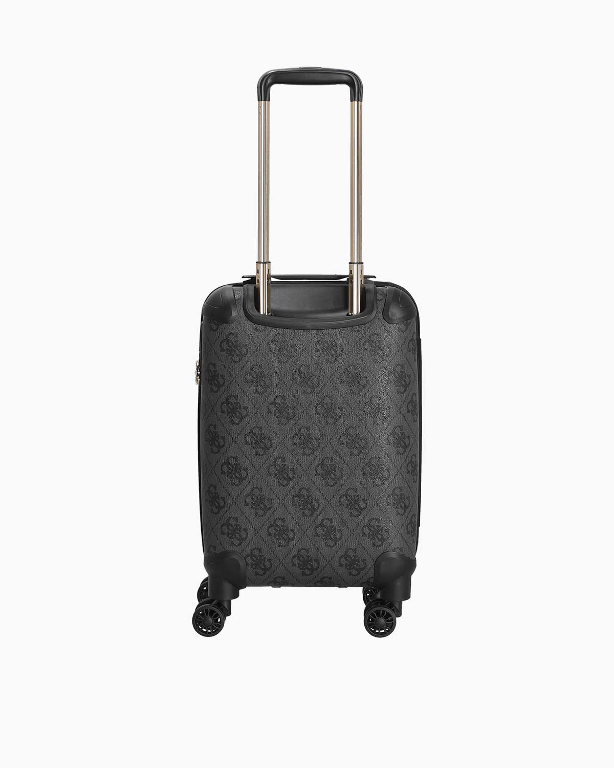 Kolayca kayan dört tekerlek, valizin hareket kabiliyetini artırarak, yoğun seyahat temposu içinde rahat bir kullanım sağlar. Donuk altın rengi metal detaylar ve 4G logo desenleri, Guess markasının zarif ve ikonik tasarımına vurgu yapar. Önde bulunan logo yazısı, markanın prestijini bir kez daha pekiştirir.