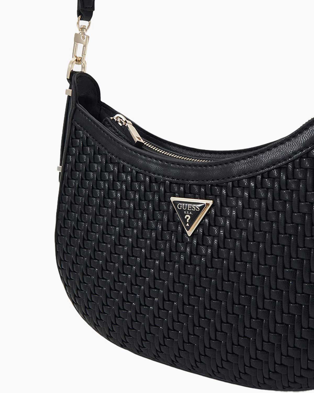 Fermuarlı kapama, içindeki eşyaların güvenli bir şekilde saklanmasını sağlar. Donuk altın rengi metal detaylar, çantanın genel estetiğine lüks bir dokunuş eklerken, öndeki metal üçgen logo, Guess markasının simgesel tasarımını vurgular.