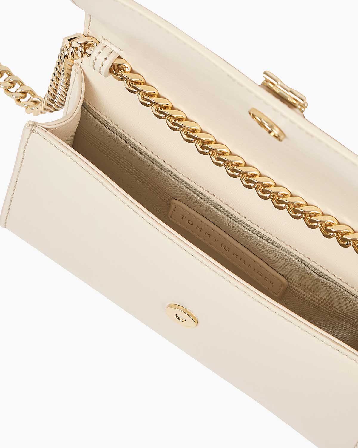 Yumuşak deri görünümlü bej yüzeyi, altın TH monogram kilit tokası ile mükemmel bir uyum yakalayarak sofistike bir hava sunuyor. Zincir askı detayı, çantaya zarif ve feminen bir dokunuş katarken, kompakt yapısı sayesinde günlük kullanımın yanı sıra özel davetlerde de mükemmel bir tercih oluyor.